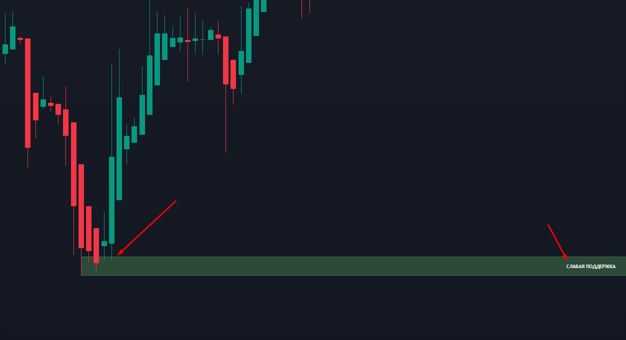 In the example we see weak support — this is when a price movement formed a level, but it has not yet been confirmed by a repeated bounce and therefore is considered "weak."