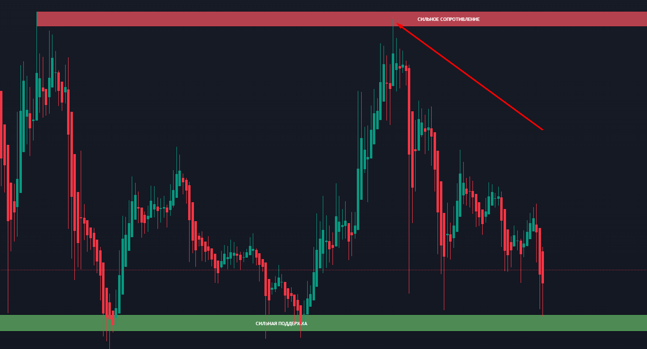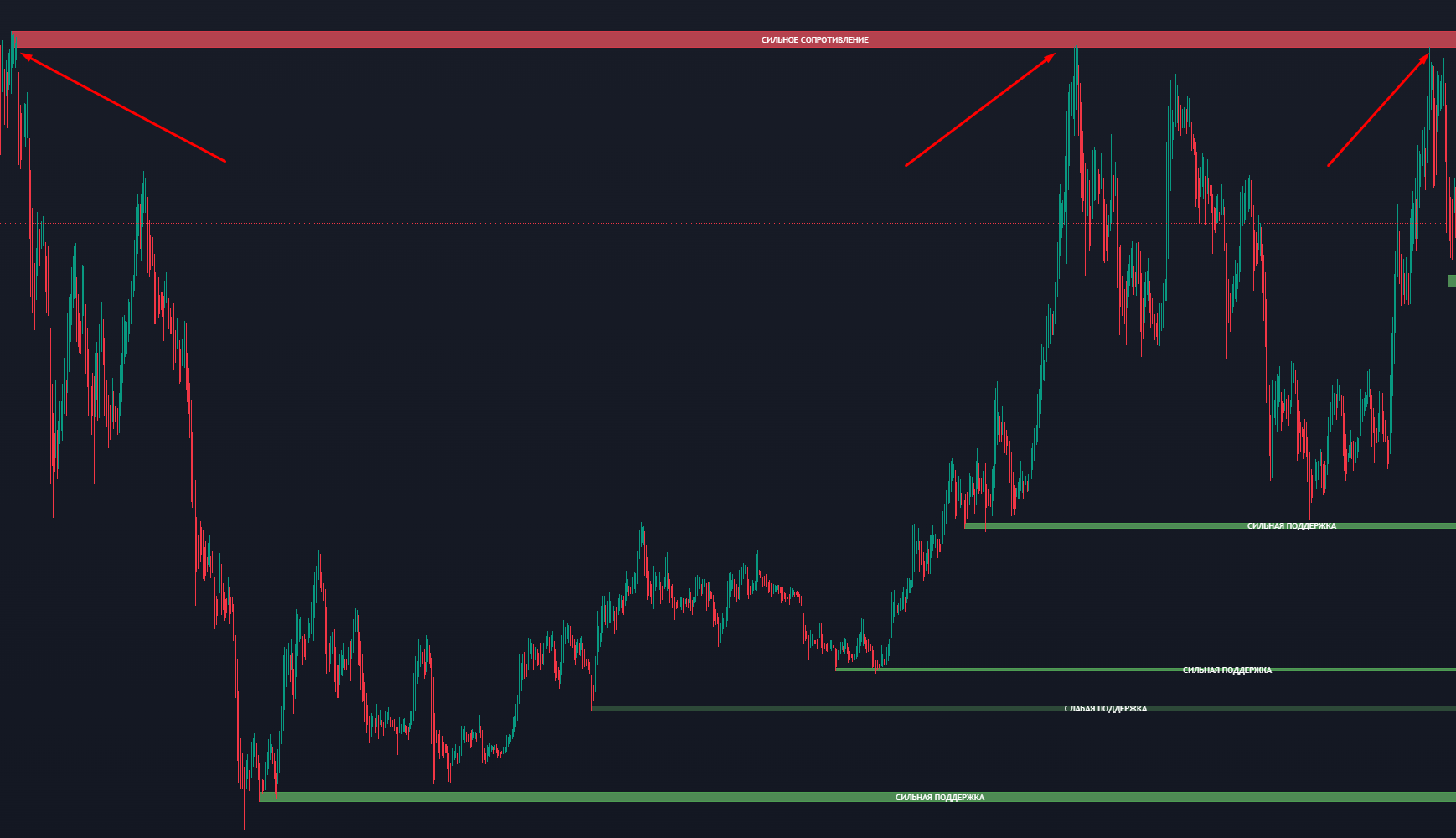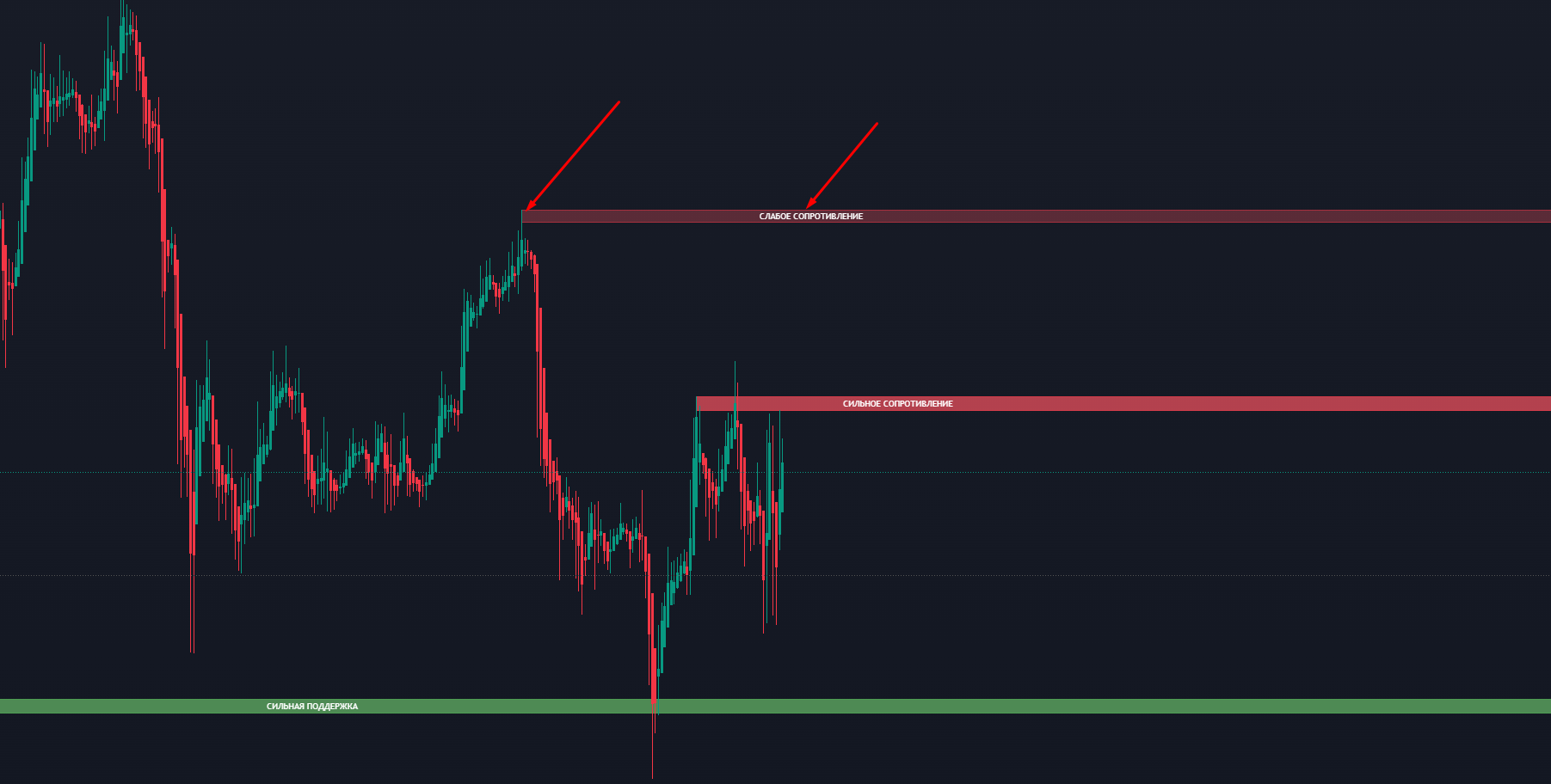 In the example we see weak resistance — this is when a price movement formed a level, but it has not yet been confirmed by a repeated bounce and therefore is considered "weak."