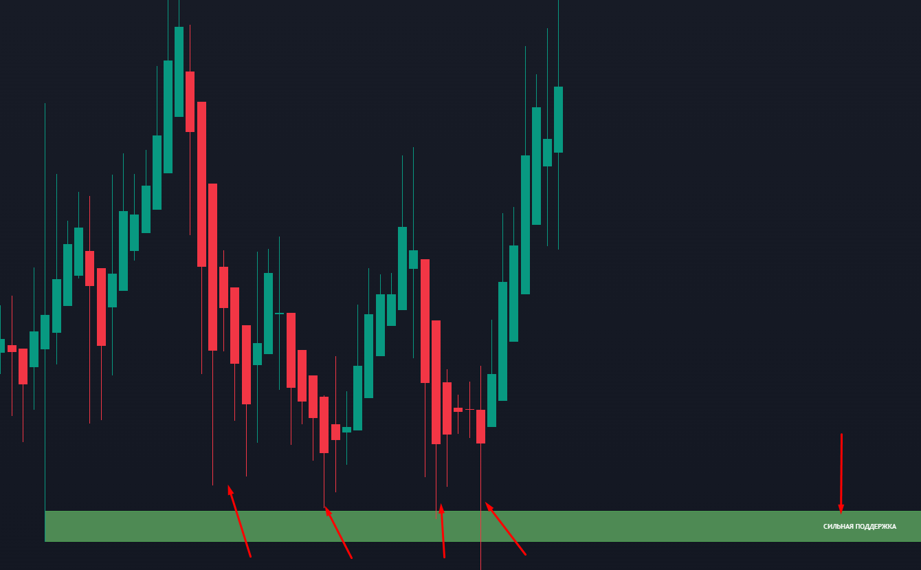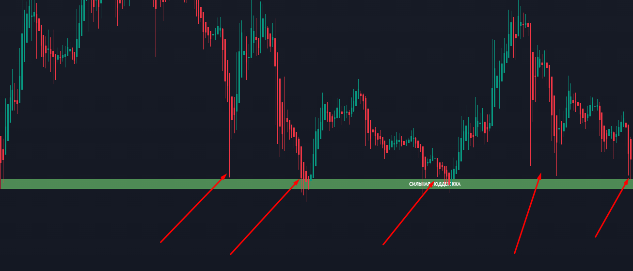 Using the daily Bitcoin chart as an example — you can see how a strong support level holds the price many times, preventing it from falling lower + each time the price makes a good bounce when it reaches this level.